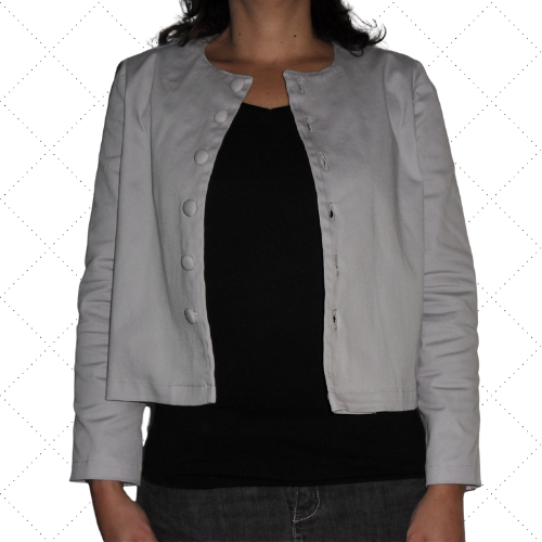 - Fournitures : 180 x 140 tissu moyen (coton, gabardine, lin) ; 70 x 40 thermocollant ; 6 boutons diamètre 2 cm