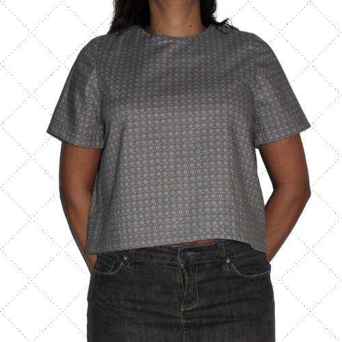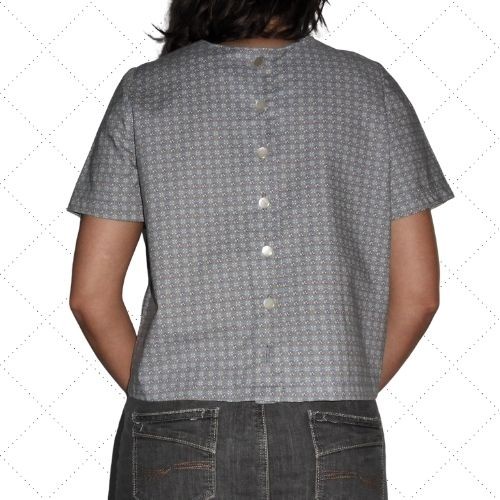 Un top plutôt sage et original printemps-été. Ras de cou, fermeture boutonnée dans le dos, taille droite confortable légèrement ample. Manches courtes simples, longueur aux petites hanches.